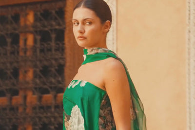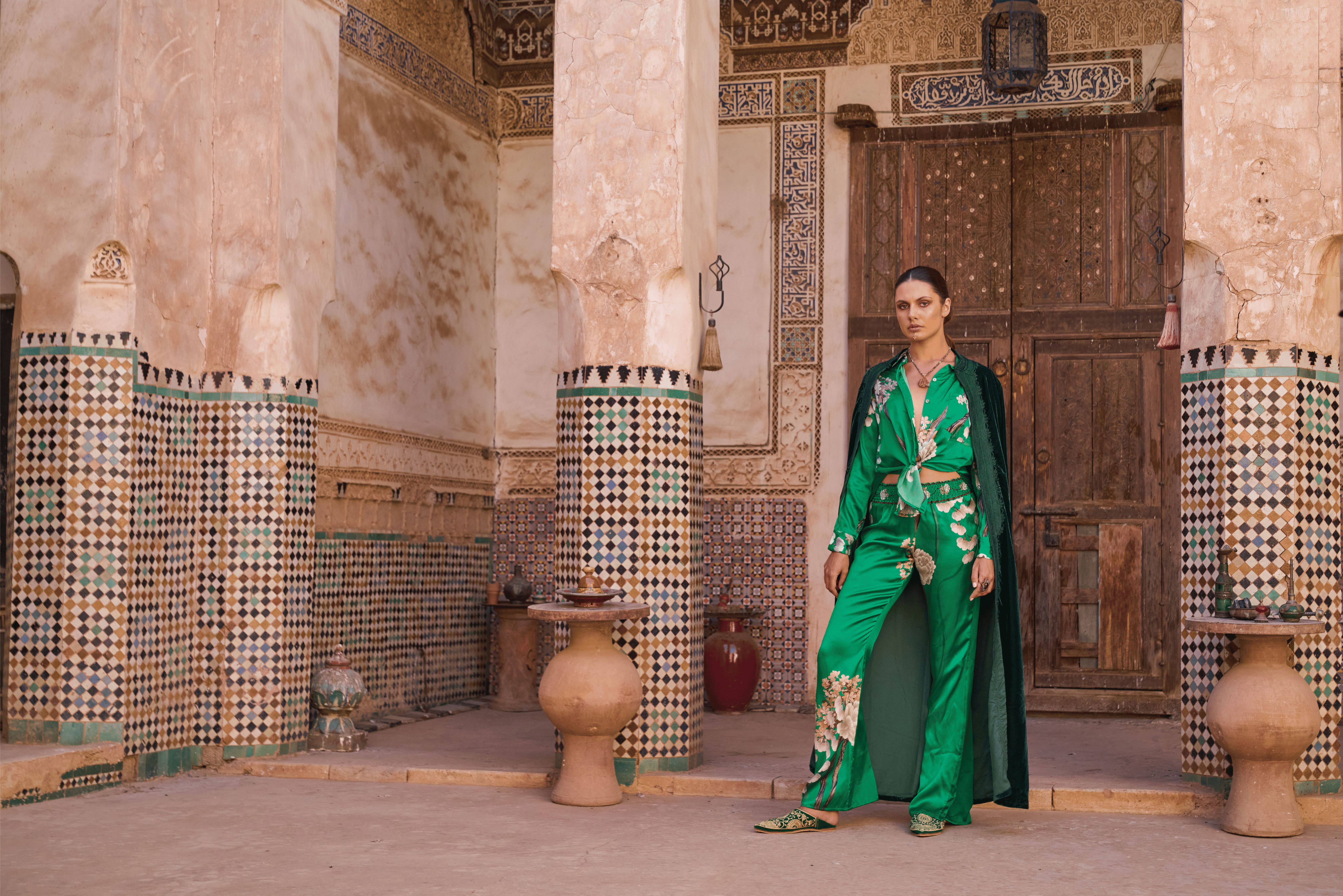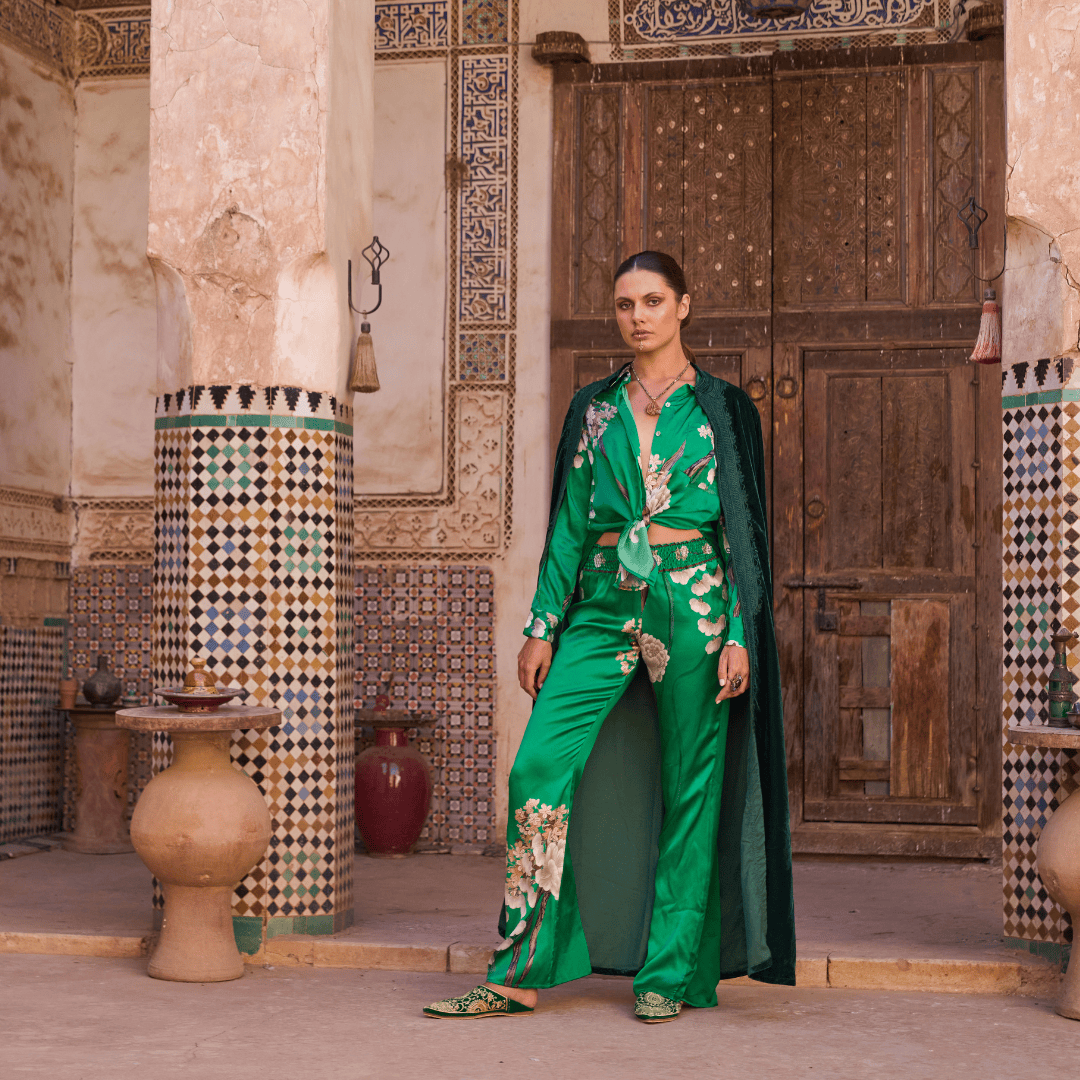 Is a collection inspired by Marrakech’s hidden riads, palaces, and vibrant markets. It blends desert-inspired prints and historic architecture with luxurious fabrics like silk and linen, offering elegant, fluid pieces designed for both resort wear and special occasions.