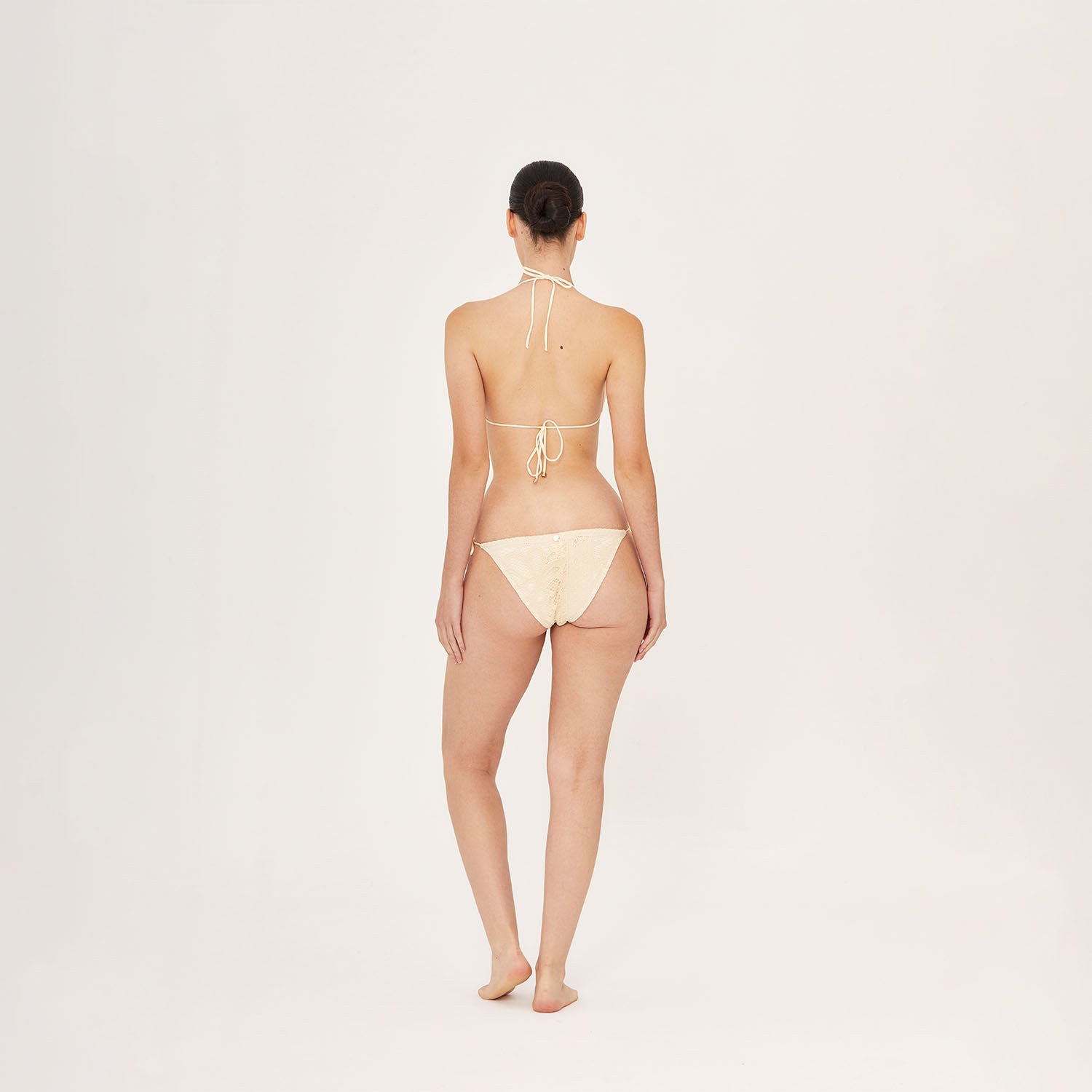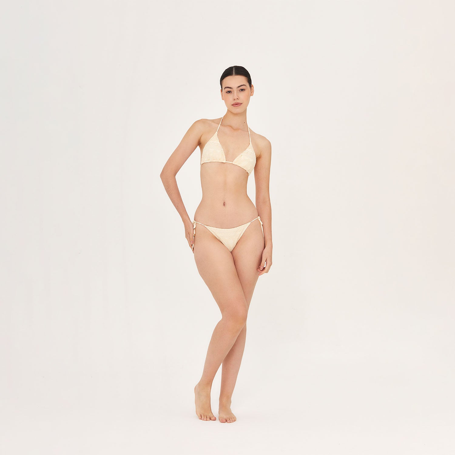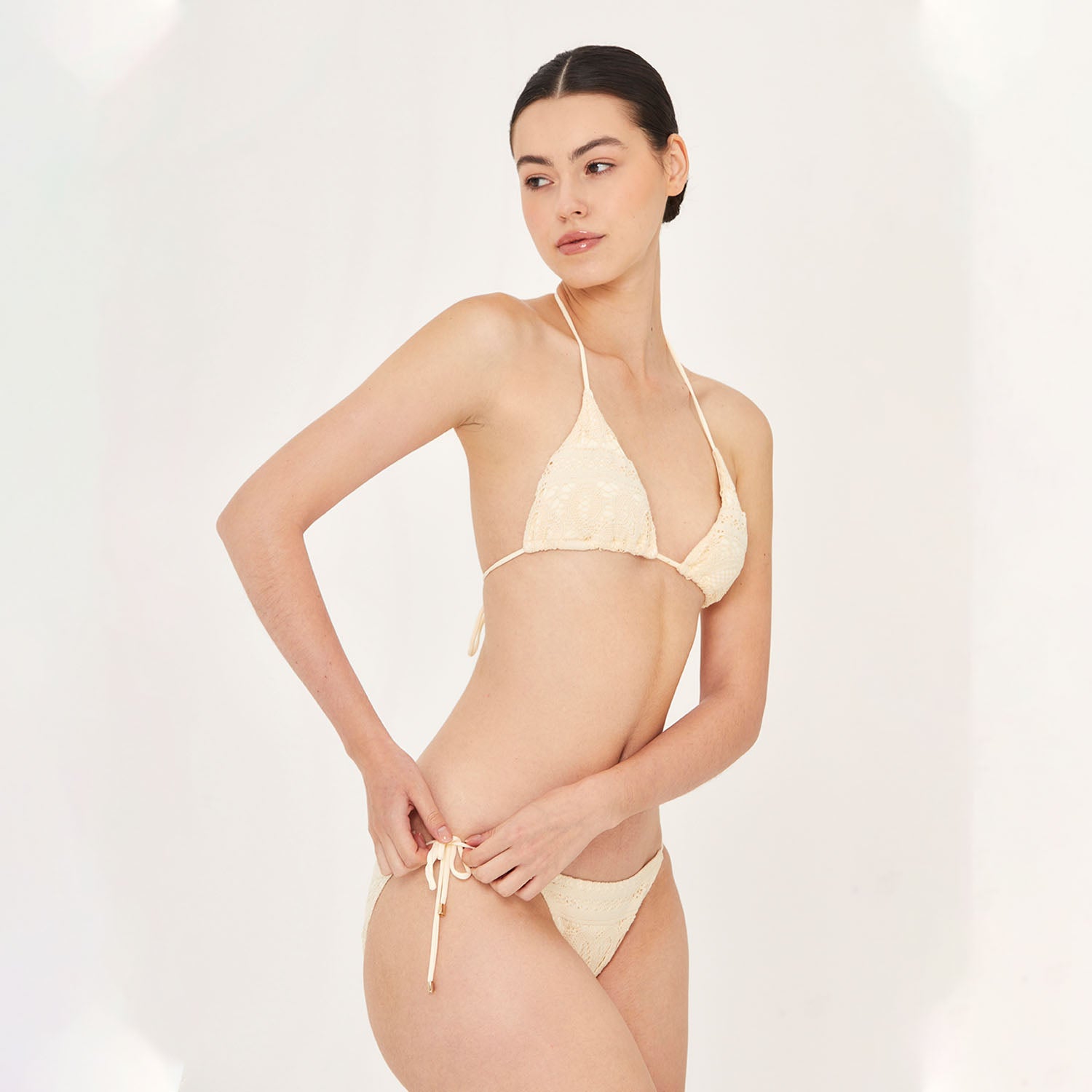 Adjustable side-tie bikini bottom features subtle gold-tone metal accents at the strap ends. Crafted from italian delicate embroidered lace exclusive to Aguaclara, made in Peru.Details: 72% Cotton & 28% Polyamide