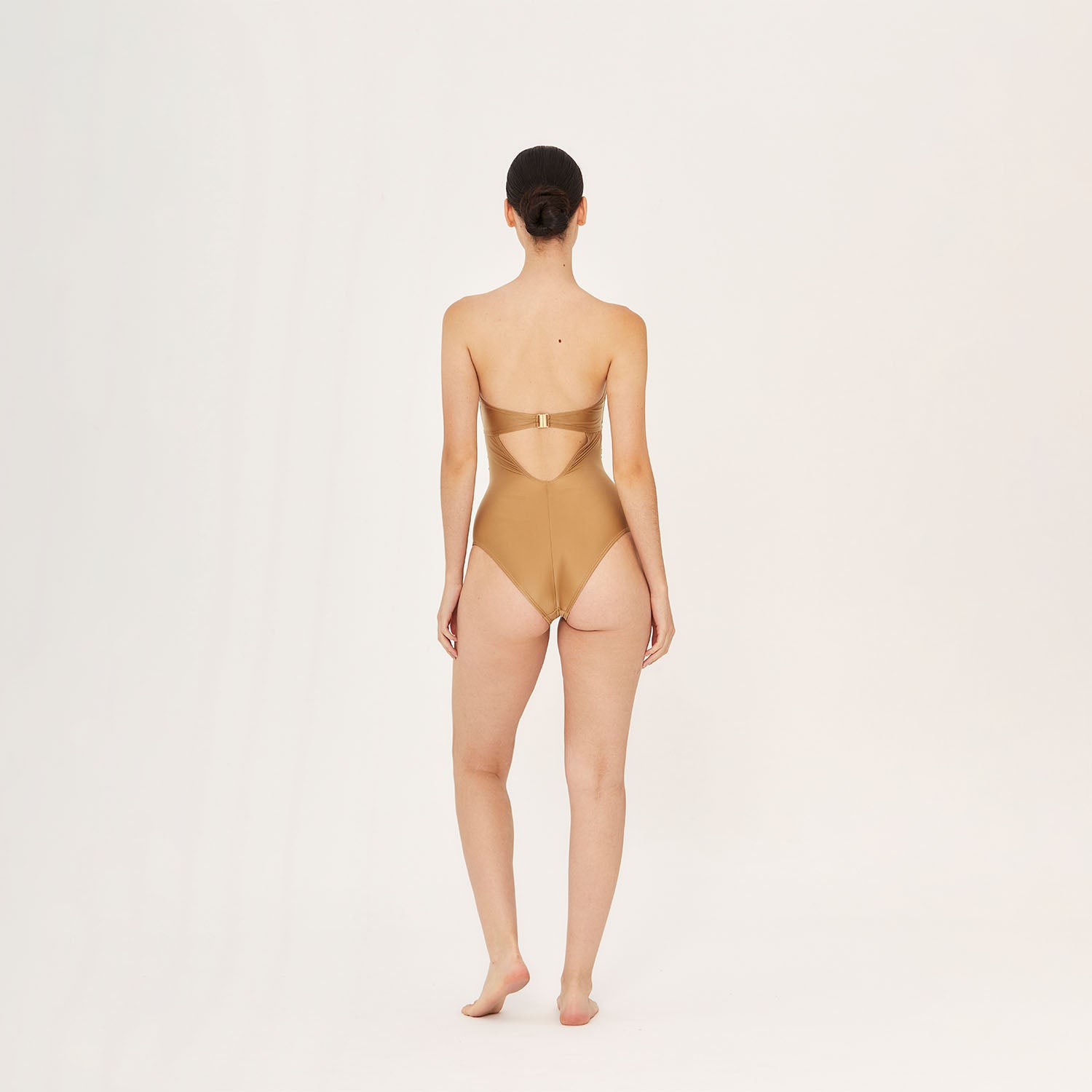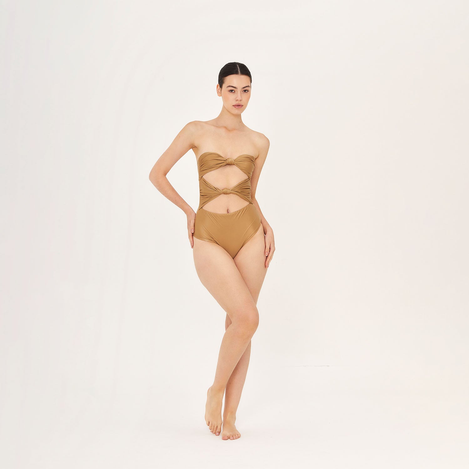 Strpless one piece designed with a bandeau neckline, knot details, and cut-outs. Crafted from exclusive satin Italian fabric, made in Peru.