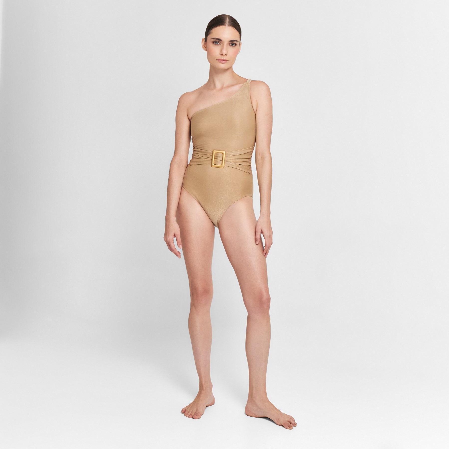 Asymmetrical swimsuit designed with an elastic belt and plexiglass buckle. Crafted from exclusive subtle shimmer Italian fabric, made in Peru.Details:79% Polyamide, 19% Metallic Fiber & 8% Elastane
